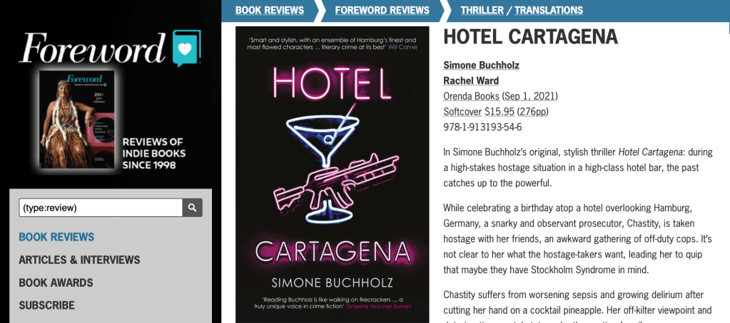 “In Simone Buchholz’s original, stylish thriller Hotel Cartagena: during a high-stakes hostage situation in a high-class hotel bar, the past catches up to the powerful. (…) The book’s spare, staccato prose crackles with energy. Its sensibilities are neo-noir, and its wit is wry. Buchholz doles out delicious black humor: a bang “could be anything: an explosion or an explosion or possibly even an explosion.” Actions are described in a palpable, immediate manner (…). And the book’s progression is high-octane: it alternates between plot threads that appear unrelated at first, but are interwoven in a manner that ramps up the intrigue and tension. All ties together before the book’s explosive climax. (Joseph S. Pete at forewordreviews.com)