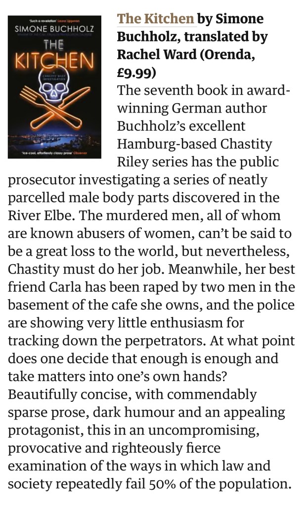 “A troubled prosecutor reconsiders her definition of justice in Simone Buchholz’s thriller The Kitchen. (…) At first, there seems to be no relationship between the victims, but when the connection reveals itself, Riley has to make important decisions about whether the system she works within is doing its job … and, if not, what she should do about it. (…) The Kitchen is a vengeance-fueled thriller in which women take power back from anyone and everyone who denies their autonomy.” (Eileen Gonzalez at forewordreviews.com)